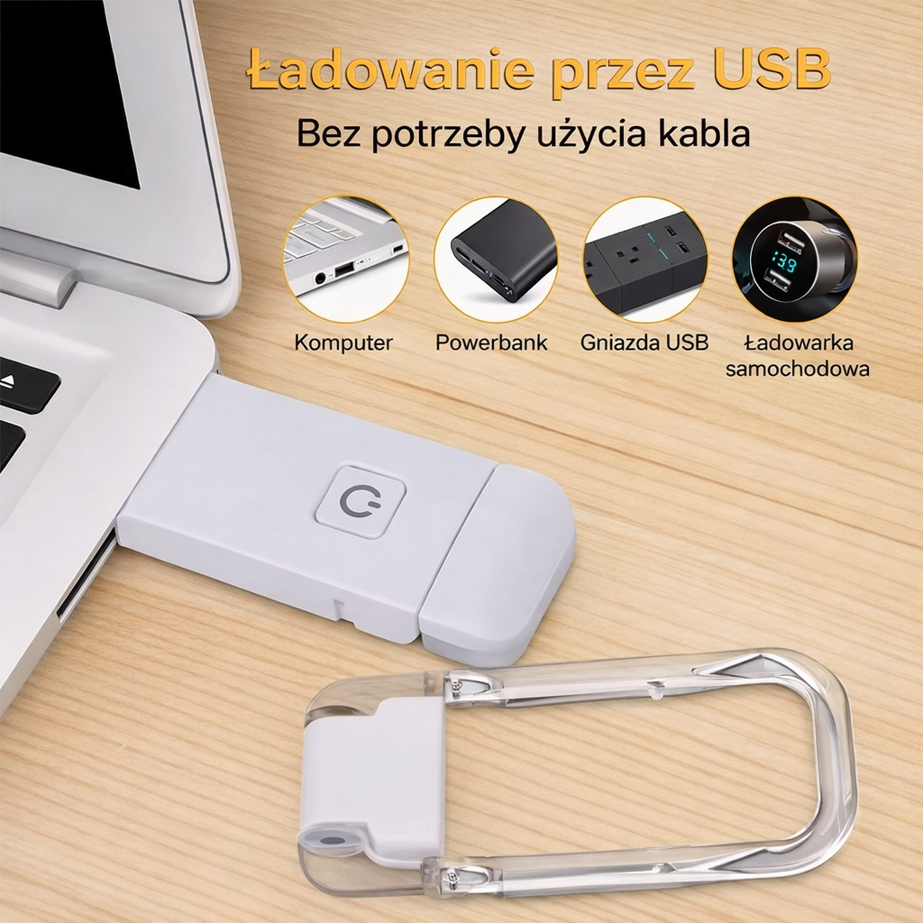 Swoją lampkę naładujesz za pomocą portu w komputerze, powerbanka, wejściu USB, ładowarce samochodowej.