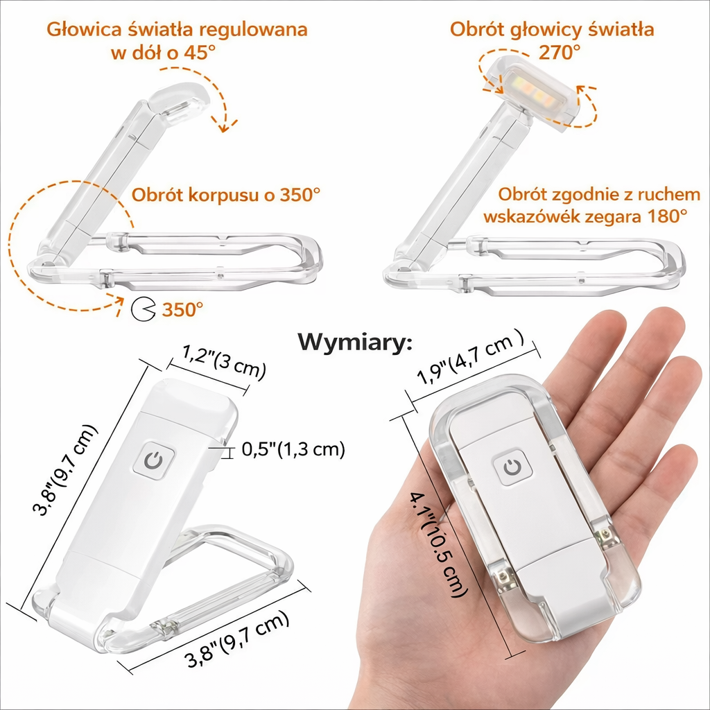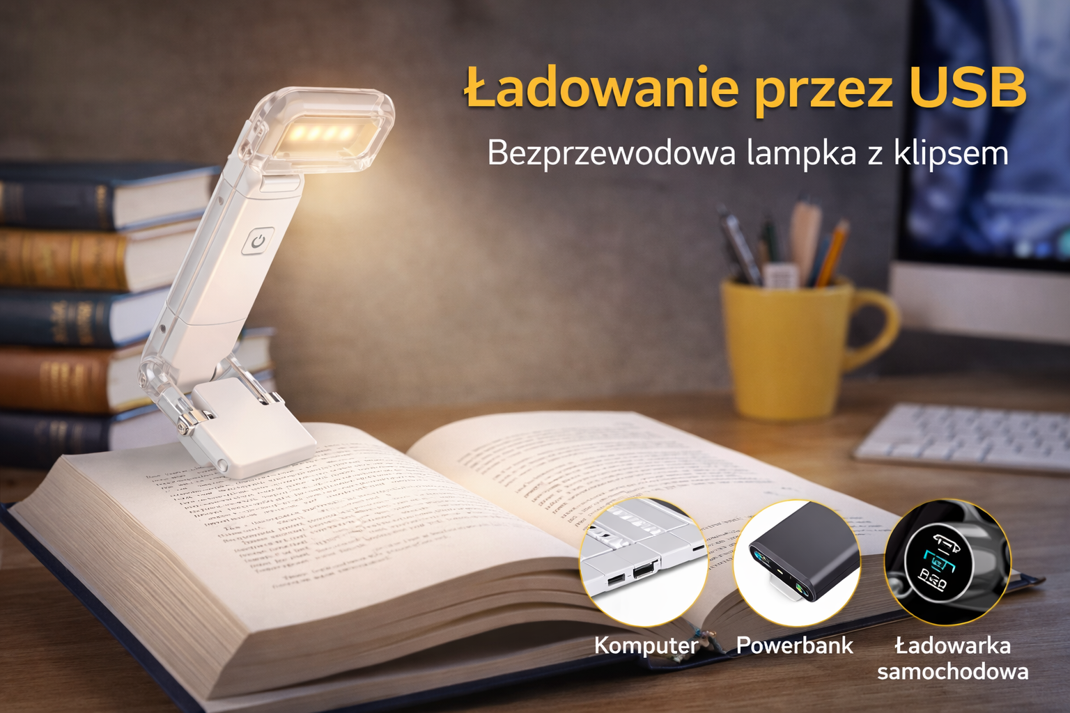 LumiClip™ oświetla dokładnie obszar czytania, eliminując cienie i odbicia. Skupione światło poprawia komfort i koncentrację.